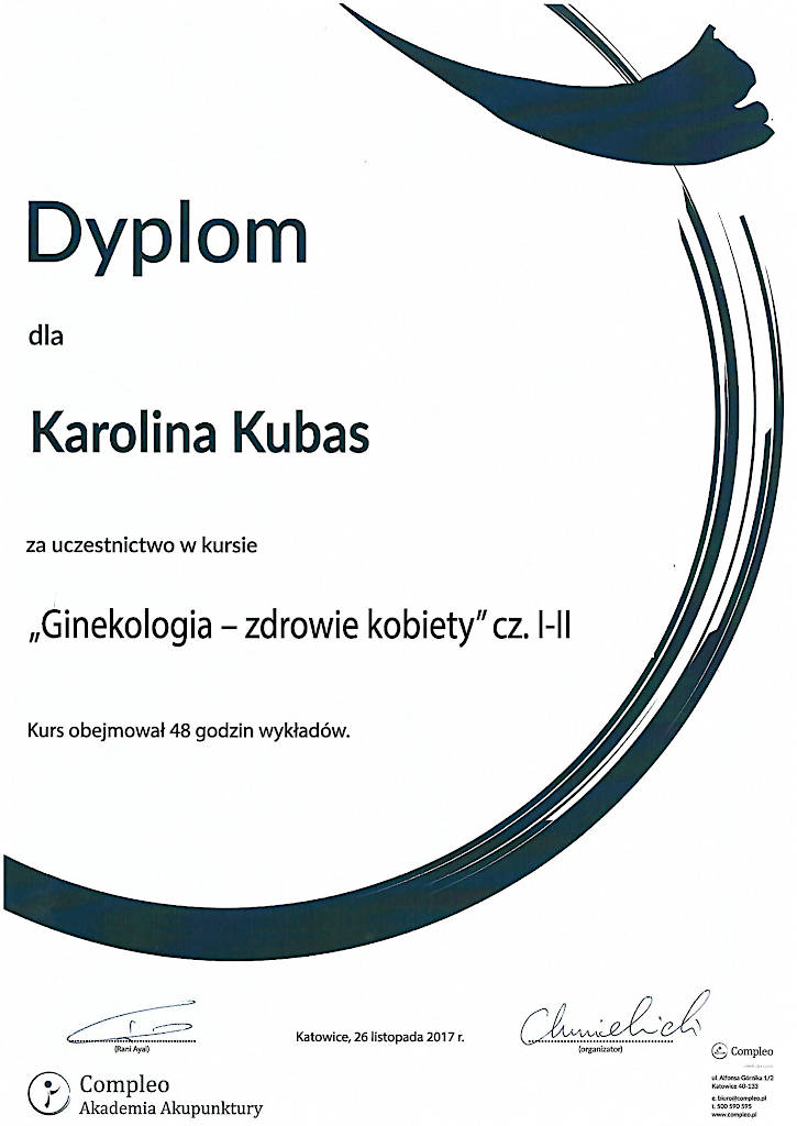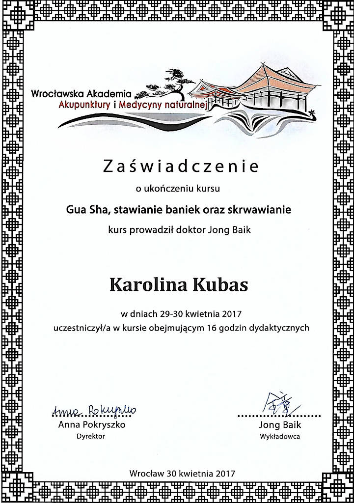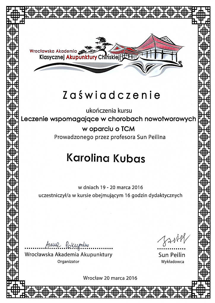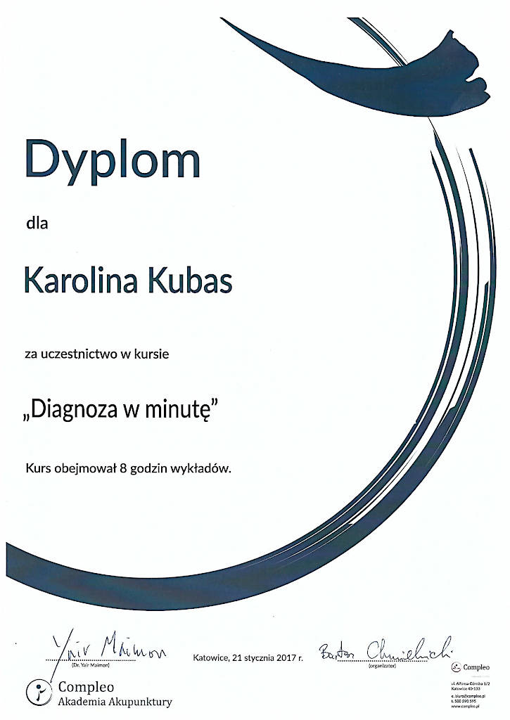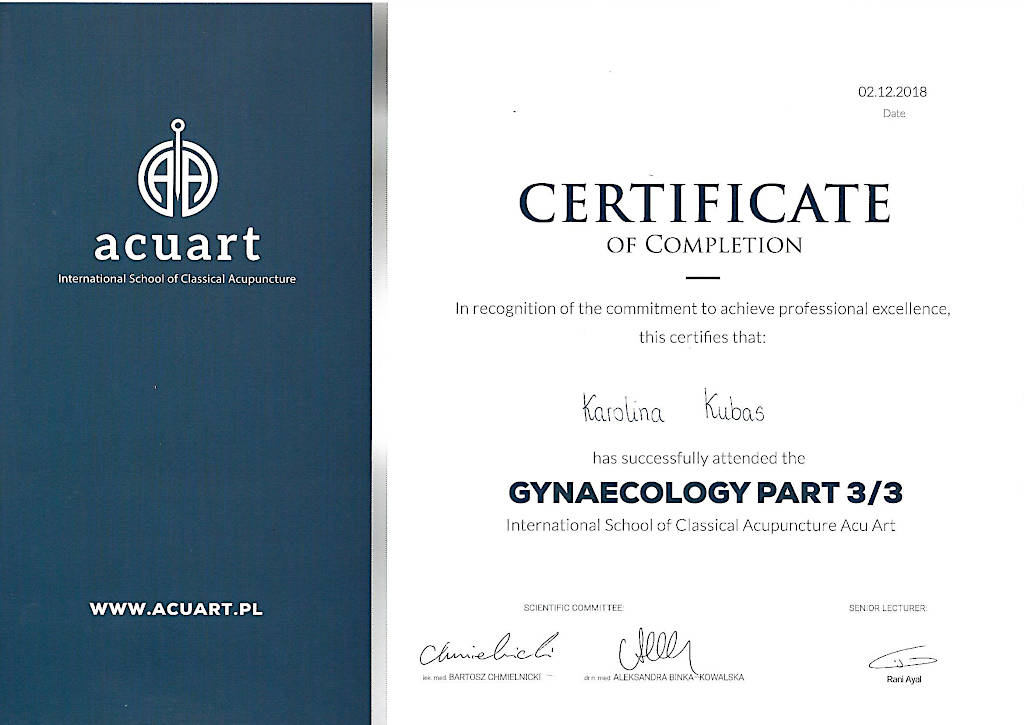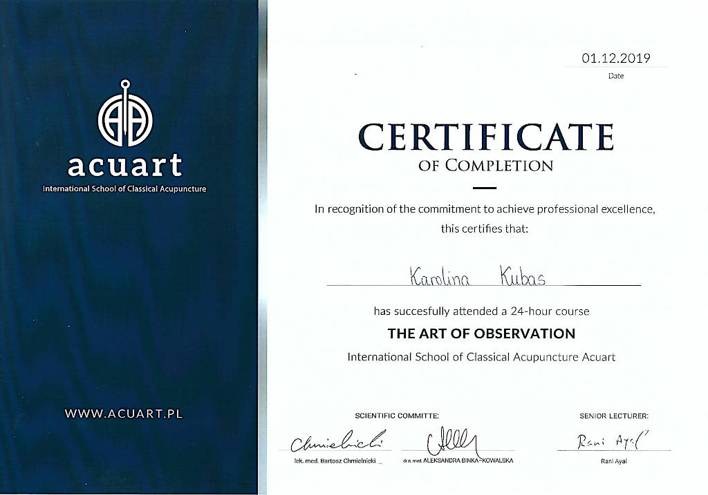 Jestem terapeutką Medycyny Chińskiej od 2015 roku. Z wyróżnieniem ukończyłam  Akademię Akupunktury Compleo w Katowicach, gdzie studiowałam Tradycyjną Medycynę Chińską. Ukończyłam 2-letnie seminarium Akupunktury Stems & Branches w Międzynarodowej Szkole Akupunktury Klasycznej Acuart.