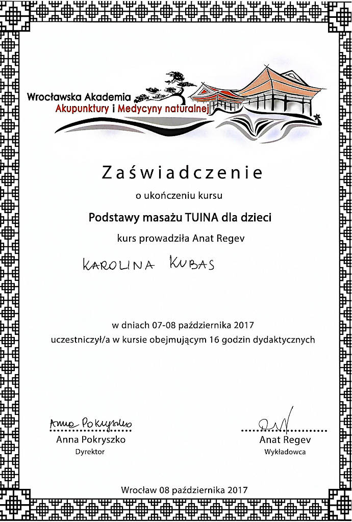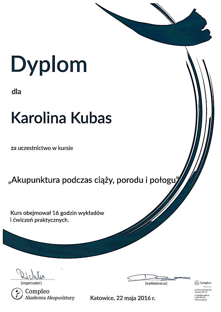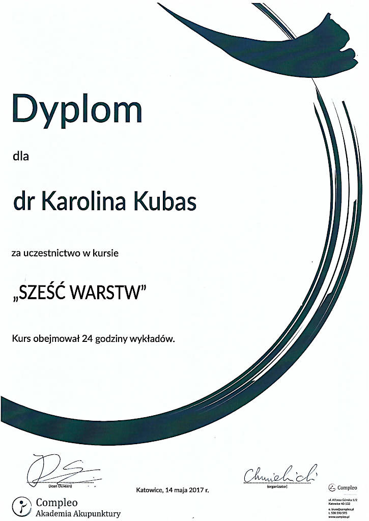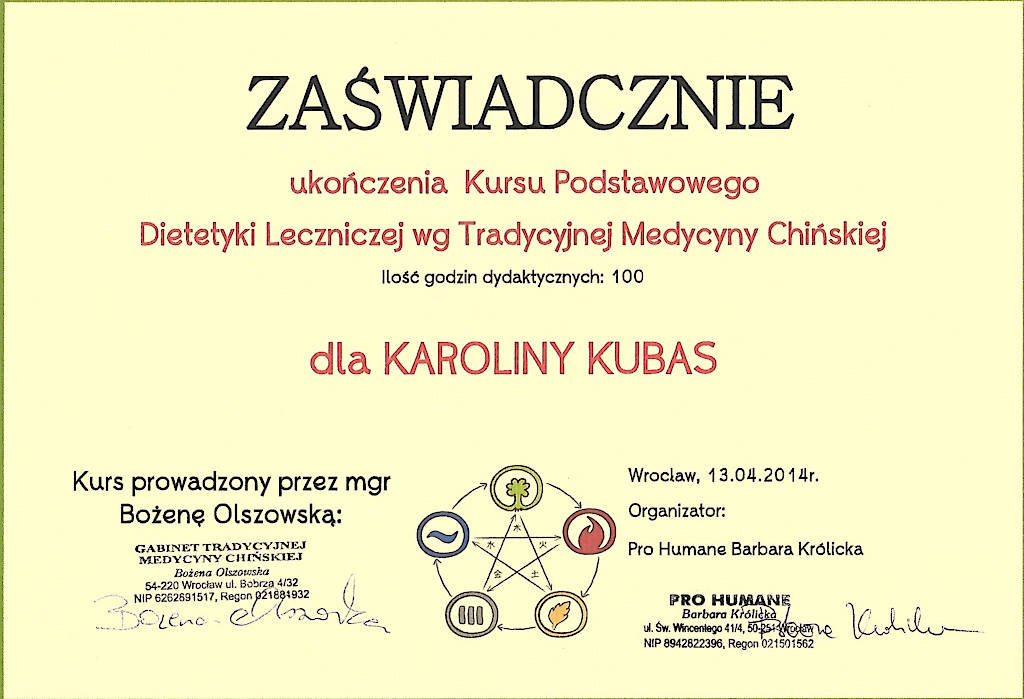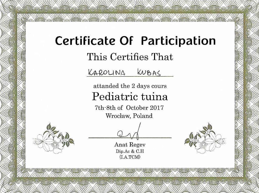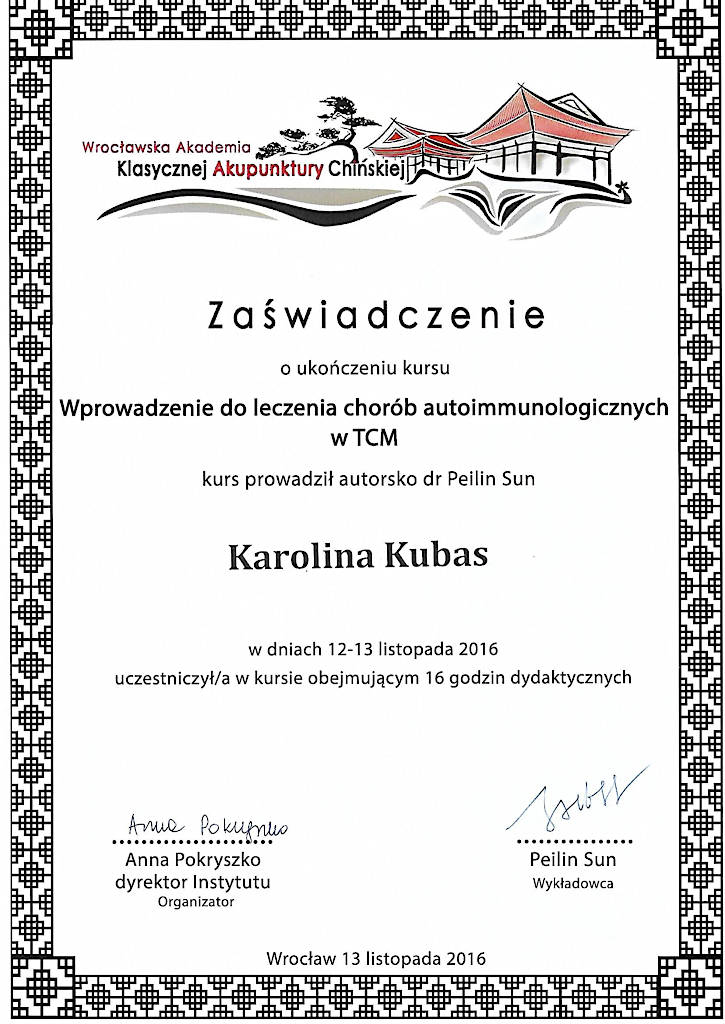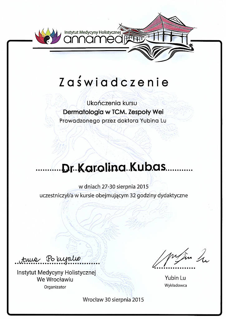 Jestem terapeutką Medycyny Chińskiej od 2015 roku. Z wyróżnieniem ukończyłam  Akademię Akupunktury Compleo w Katowicach, gdzie studiowałam Tradycyjną Medycynę Chińską. Ukończyłam 2-letnie seminarium Akupunktury Stems & Branches w Międzynarodowej Szkole Akupunktury Klasycznej Acuart.
